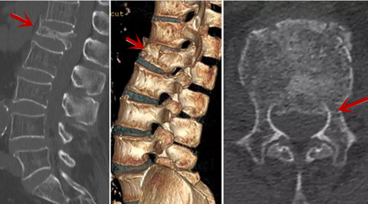 從左向右依次為CT矢狀位重建圖像、三維重建圖像、軸位掃描圖像,箭頭提示腰1椎體爆裂性骨折