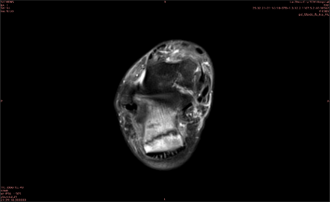 隱性骨折在MRI表現(xiàn)為T(mén)1WI序列上見(jiàn)由關(guān)節(jié)面向骨干走行的形態(tài)各異低信號(hào)區(qū),有線狀、條狀、紊亂低信號(hào),信號(hào)強(qiáng)度不均勻。與T1WI低信號(hào)改變相對(duì)應(yīng)部位在T2WI上表現(xiàn)為相應(yīng)形狀的高、低混雜信號(hào),且部分低信號(hào)周?chē)梢?jiàn)高信號(hào)水腫改變。STIR序列圖像上病灶呈顯著高信號(hào),與信號(hào)被抑制的臨近正常骨髓形成鮮明對(duì)比,分界也較T2WI成像更為清楚。脂肪組織抑制技術(shù)是MRI的一個(gè)重要性能,脂肪抑制技術(shù)在MRI應(yīng)用中可以改善組織對(duì)比和增加病變顯示機(jī)會(huì),這樣骨髓的脂肪抑制后就不會(huì)有任何信號(hào),而隱性骨折線及骨髓水腫的異常高信號(hào)就會(huì)更加明顯的顯示出來(lái)。
