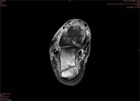 專(zhuān)業(yè)解釋看不懂沒(méi)關(guān)系,大家看圖1和圖2就可以了,這是同一個(gè)患者跟骨的磁共振和CT圖像,圖1的紅色箭頭指示的黑線就是磁共振圖像顯示的骨折線,一目了然。而對(duì)比圖2的CT圖像上并未顯示異常。